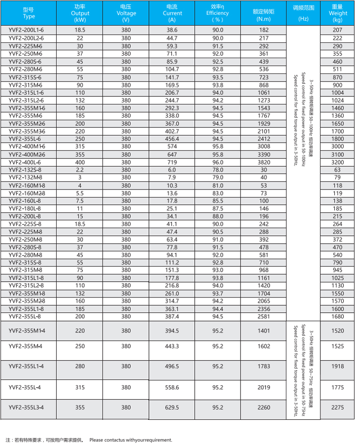 YVF2系列電機是可以采用變頻器供電的三相異步電動機,是電機節(jié)能的一種典型應(yīng)用,采用特殊的絕緣系統(tǒng)吏其能適用于變頻器供電系統(tǒng),一般額定電壓380V,頻率50Hz,5~50Hz為恒轉(zhuǎn)矩,50~100Hz為恒功率,也可根據(jù)用戶要求確定額定點的電壓和頻率,防護(hù)等級IP55、冷卻方式IC416、安裝方式符合IEC和DIN標(biāo)準(zhǔn)。